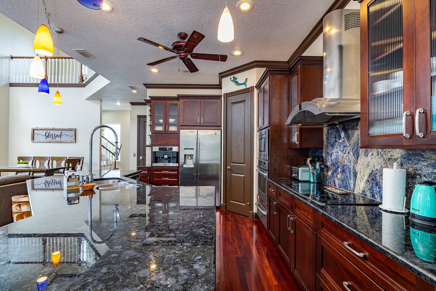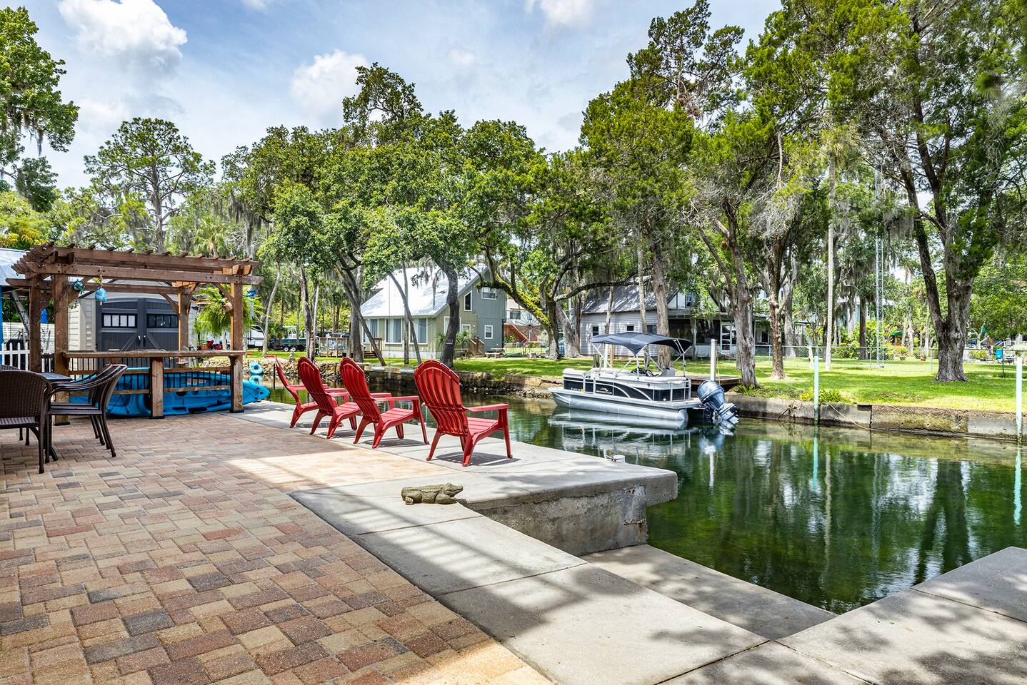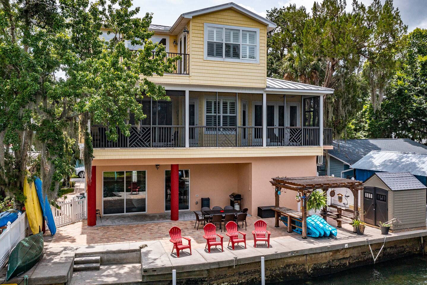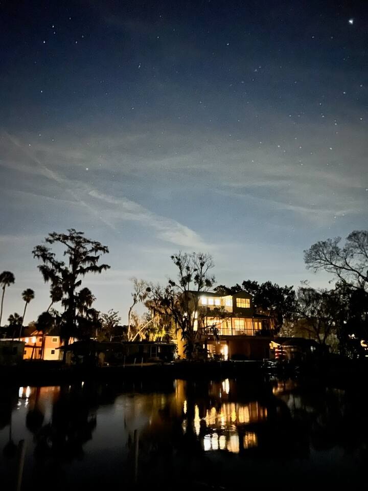 We may be biased, but we think this is the best place on the river ;) #1 Feature: DIRECTLY ON THE CLEAR WATERS OF THE WEEKI WACHEE RIVER We are directly on the crystal clear waters of the Weeki Wachee River! And we're literally 3 river bends down river from Roger's Park and just up river from the famous "Hospital Hole" where the manatees congregate in droves. We are far enough down river that you are more likely to see manatees swim right by the house than most other properties... quite frequently actually! There's even a nice wide step-out area on the river to get into the water for swimming or kayaking or boating - directly from the back yard. I am often asked if the water is clear where we are. Yes! The water is definitely crystal clear. The bottom is not white sand like further up river, but when a dolphin or manatee swim by, you can see them clear as day. I was literally swimming and cooling off while working outside and a manatee came right up to me. I could see it's face in the water from 10 feet away and then it swam right under me rubbing my feet! Shortly after, a dolphin swam by as well... still amazes me to watch dolphins and manatees swim by the back yard. #2 Feature: NEWLY BUILT HOME ON THE RIVER This is one of those rare newly built houses on the river, but it's not just a more modern build. This house was built with luxuries, like the granite in the kitchen was imported from Italy... yeah literally imported from Italy. There's a 3rd story master bedroom suite with an outside balcony - the views from up here are spectacular! The two bedroom on the second floor both have balconies. The second floor balcony is big enough for everyone The multiple balconies make it easy to spot the manatees swimming below, or sit back at sunset and watching the sky light up like a canvas. This house even boasts an elevator that can be used by request for the elderly or handicapped! The outside has beautiful concrete interlocking pavers connecting the front yard with the back via a walkway to the patio on the river. #3 Feature: DEEPER WATERS We are located on a deeper part of the river for better fishing and tying your boat up - right from the back patio... and deep enough that you can literally jump in and do a cannon ball, enjoying the natural spring fed waters to keep you cool in the summer... or warm in the winter months. The water temperature is 74 degrees all year round! #4 Feature: NATURE - LOCATION, LOCATION, LOCATION Weeki Wachee River is an amazingly beautiful natural wonder! You have over 6 miles to boat, canoe or kayak up river, taking in the peaceful sounds of the water, birds and the wind blowing through the trees. You'll experience manatee on the river, more often than not, but that's not the extent of the amazing wildlife. We've watched a family of deer cross the river right in front of our kayaks - what a treat that was! We've sat and enjoyed river otters playing with each other like little kids. If you're lucky, you'll even spot an occasional dolphin enjoying the river... there's just something special about watching a dolphin swim right in front of the house. There are vast species of birds, like the wood storks, blue herons, egrets, bald eagles, ospreys, double-crested cormorant, but that's just the tip of the ice bird... the bird diversity is phenomenal with 273 native and 8 exotic species in the area. #5 Feature: CLOSE TO THE GULF OF MEXICO If you travel down river, the Gulf of Mexico is just over a mile away. The short ride to the Gulf is worth it! The open views shouldn't be missed. And it goes without saying, the wonderfully diverse fishing options can keep any angler busy. So go intercoastal or deep sea fishing, scalloping (when in season), dolphin sightseeing, or just sit there and wait to watch the sunset without a single thing blocking your view. #6 Feature: WEEKI WACHEE SPRINGS STATE PARK The world famous Weeki Wachee Springs State Park is a five mile drive away. Make sure to enjoy the mermaid show, it's great for kids and adults too. Don't miss the guided river boat tour, it's worth it. Buccaneer Bay is an add on ticket where the family can enjoy swimming - right next to the head of the spring, or relax on their white sand beach or have some fun speeding down the giant water slides. #7 Feature: ALFRED A MCKETHAN PINE ISLAND PARK Alfred A McKethan Pine Island Park has a wonderful beach that's great for long walks, sunbathing, building sand castles, watching the sunset... you know, all of the beachy stuff. And it's less than a 10 minute drive. Bullet Point House Features: *Directly on the clear waters of the river and deep enough to dock a deep hull boat *Newer home with beautiful interior design *Interlocking concrete paver patio on the river *Plenty of seating inside and out *2nd and 3rd floor balconies looking over the river to enjoy the trees, birds, and marine life *Four bedrooms (new beds/mattresses) and three baths, with 7 beds to sleep 14 guests *The use of seven adult single kayaks and two three person canoes (life vests and paddles included) that are stored and can be launched directly into the river from the house *Nice outdoor corn hole game for everyone to enjoy *TVs in the living room, porch, and two bedrooms. Each TV has DirecTV (with the Go Big channel package which includes the sports channels), Hulu, Disney+, HBO Max and Amazon Prime TV.... pretty much every show and channel you can think of - there's more content than you could ever watch in a lifetime *Gas grill *Onsite parking for 4-6 cars (please arrange other parking arrangements if there will be more than 4-6 cars) *Tie off available for a boat *Washer and dryer NO PETS NO PARTIES